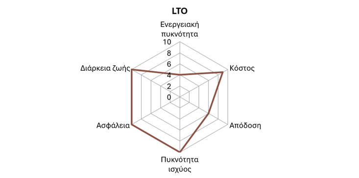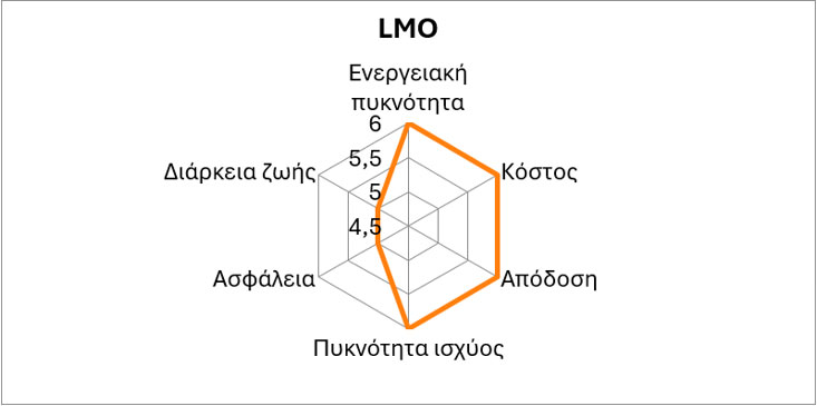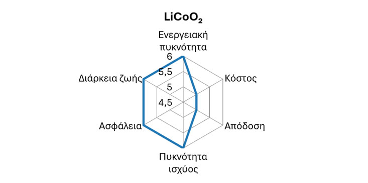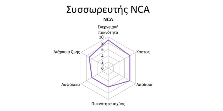 Σύγκριση παραμέτρων που προσδιορίζουν τη συνολική απόδοση σε κάθε τύπο χημείας συσσωρευτή ιόντων λιθίου.